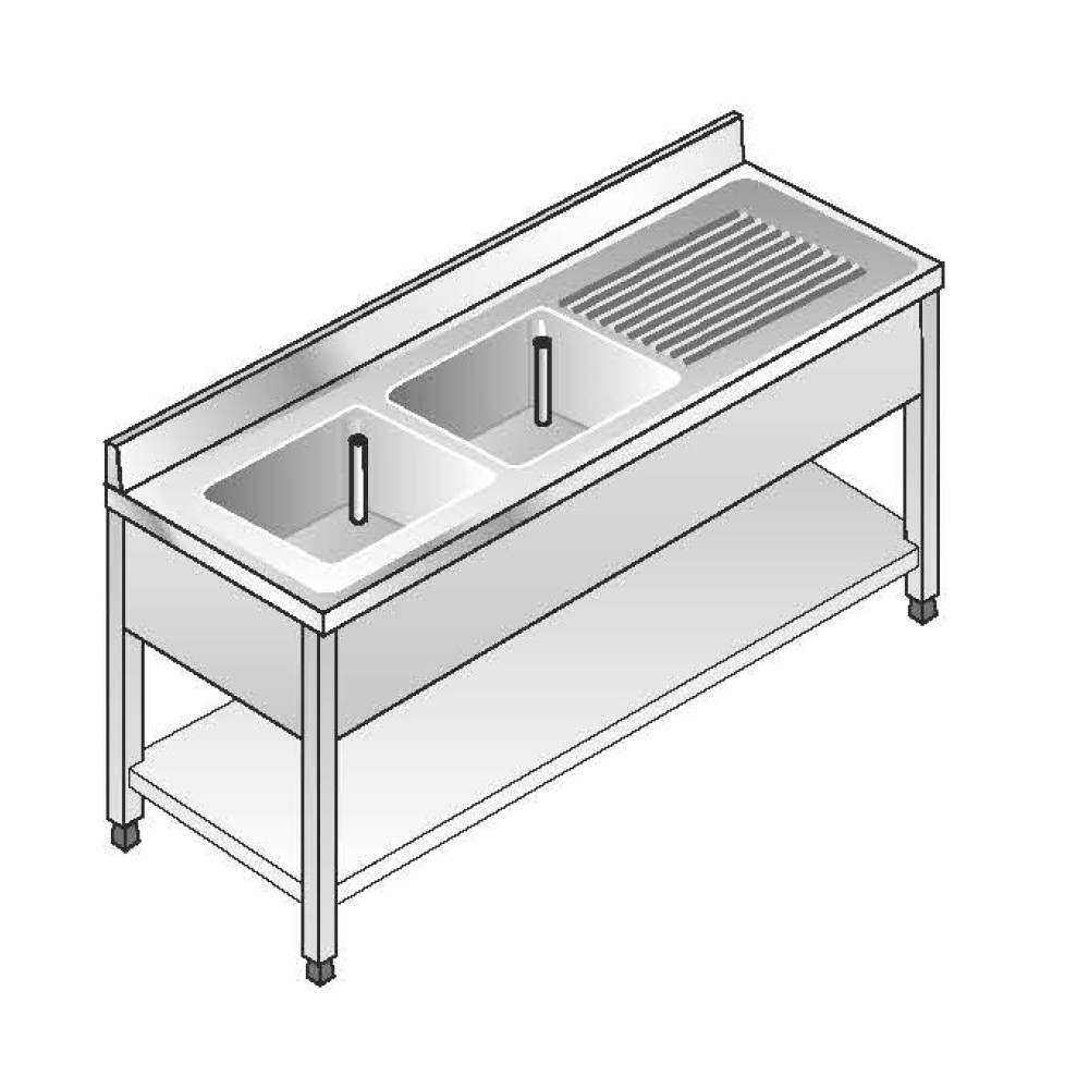 Lavello Acciaio Inox AISI 304 - 2 Vasche SX - Sgocciolatoio DX - Dim. 180x70x85 cm - con Alzatina